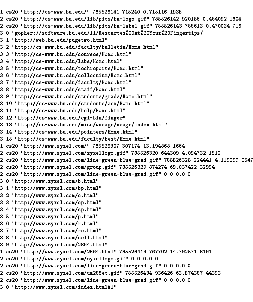 Lines in the document structure log consist of two formats. For type 1 and 2 lines, the format is: the line type; the machine name; the URL; seconds and microseconds since 1/1/70 when the request was made; the round trip retrieval time; and the item's size (including the protocol overhead). If the object's size and time are zeroes, no transfer took place, possibly because the objest was shared by other documents. For type 3 lines, the format is: the line type; the sequence number of the reference within the document (numbered sequentially starting from 0 for each document); and the reference itself. A typical segment of a document structure log is shown in Figure 1.