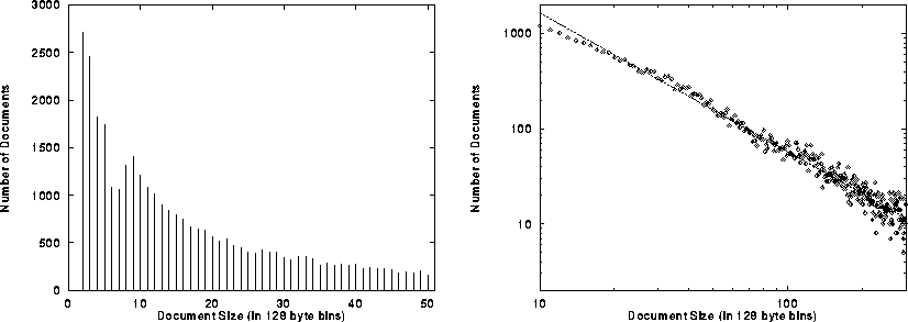 Figure 4 shows the size distribution of objects referred to at least once in our logfiles. Although this is not a random sample of documents available on the Web, it provides a reasonable estimate of the actual size distribution of Web documents. On the left of the Figure is a histogram of file sizes up to 6400 bytes; on the right is a histogram on a log-log scale of file sizes of 1280 bytes or more.