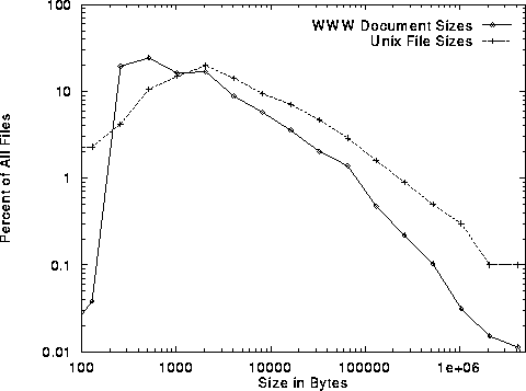 Previous studies of file sizes in general purpose Unix systems has shown that small sizes are much more common than large sizes [7,12]. However, in view of the potential use of the Web to publish multimedia objects, documents on the Web could have a significantly different distribution from those in general purpose file systems.