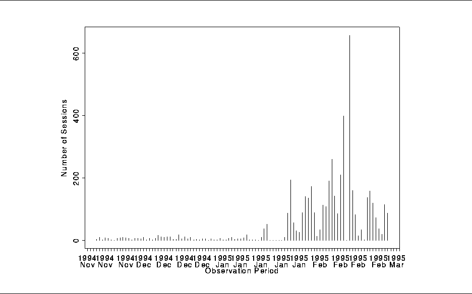 During the data collection period a total of 4,700 sessions were traced, representing a population of 591 different users. A histogram of the number of sessions per day is shown in Figure 2. The Figure shows considerable variation over time. The enabling of tracing in B19 is clearly visible in the middle of the plot. However, even within each data collection regime (before or after B19 was enabled) there is considerable day-to-day variation in the WWW demand at our site as measured by user sessions.