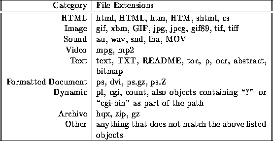 One interpretation for our file size distribution data is based on file type. It may be that (smaller) HTML files are preferred by users over (larger) images, leading to user preference for small files. To investigate this, we classified WWW objects into 9 categories, based mainly on file extension, as described in Table 7. The distribution of document requests by type is shown in Table 8. This table shows that user preference for small documents is not due to a preference for HTML files over images; in fact, the reverse is true --- image files are by far the most commonly requested object, and they tend to be significantly larger than HTML files.