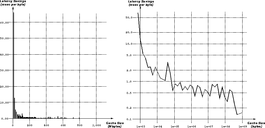 Using the resulting distribution of cache sizes as a function of file sizes cached, we can predict the effect of caching using various cache sizes. We replot the data in Figure 10 as follows. Instead of plotting the latency savings per file size, we plot the latency savings against the cache size corresponding to the proper file size. The result is shown in Figure 12. On the left is the function on linear axes; on the right it is plotted on log-log axes.
