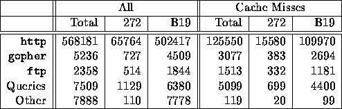 Finally, Table 3 shows the distribution of requests among the different access protocols. The row Queries refers to requests containing cgi-bin in the URL. The first three columns include all the references, whether they were served by a WWW server or from Mosaic's internal cache. The second three columns consider only the requests that were statisfied by a WWW server.