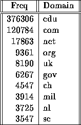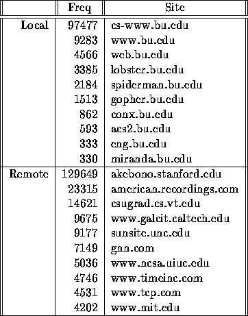 The Table shows that from a total of 575,775 requests, 452,862 were for servers outside of the BU domain. This corresponds to 78.6% of all requests. The requests include references to 3026 different sites, of which 2987 were remote and 39 were local. Table 5 summarizes the 10 top most popular sites, local and remote. In addition, Table 6 lists the most popular top-level domains.