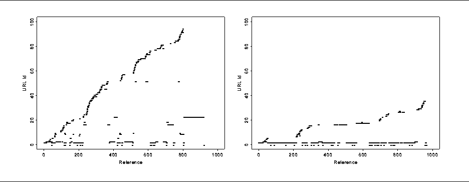 Since we are interested in using user profiles and user past history in directing prefetching schemes, we studied the rate of user access to new objects in the Web. To do so, we plotted diagrams showing the patterns of individual users access to new and previously seen URLs. Two such diagrams are shown in Figure 3. In these figures, the horizontal (x) axis represents successive WWW requests by a single users. Each time the user requests a previously unseen URL, that URL is assigned a new ID, which is shown on the vertical (y) axis. If the user were continually accessing new URLs (pure ``surfing'') the diagram would have a slope of 1. If the user were continually accessing the same URL, the diagram's slope would be 0. These figures show that different users exhibit different degrees of temporal locality and make different demands for new URLs, which affects the performance of document caching.